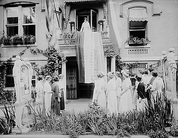 A Miss Paul raising the suffrage ratification banner. Location Unknown.