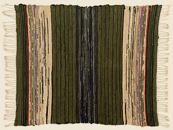 Set free by the artistic expression available through her craft, Eleanor Arms reveled in her work as a weaver. As she put it, "There is nothing more fascinating to my way of thinking than sitting down to a perfectly strung loom and building up something beautiful, with no pattern beyond the love for color harmony which is part of every weaver's natural equipment."1 Eleanor's aptly titled cotton, silk, and velvet table cover, Beside the Garden Path, features a luxuriant combination of textures, pattern, and rich earth-toned hues. Deerfield rug makers brought a modern sensibility to this traditional craft. As Eleanor expressed to potential customers, "Rag rugs are no longer made of heterogeneous scraps, the years' accumulation of cast off clothing, as in colonial days. Material is carefully selected and thoughtfully combined, so that even the hit-or-miss rug of our grandmothers--so often a "miss"--while losing none of its utilitarian qualities, has here become a glorified "hit," a thing of real artistic beauty..."2